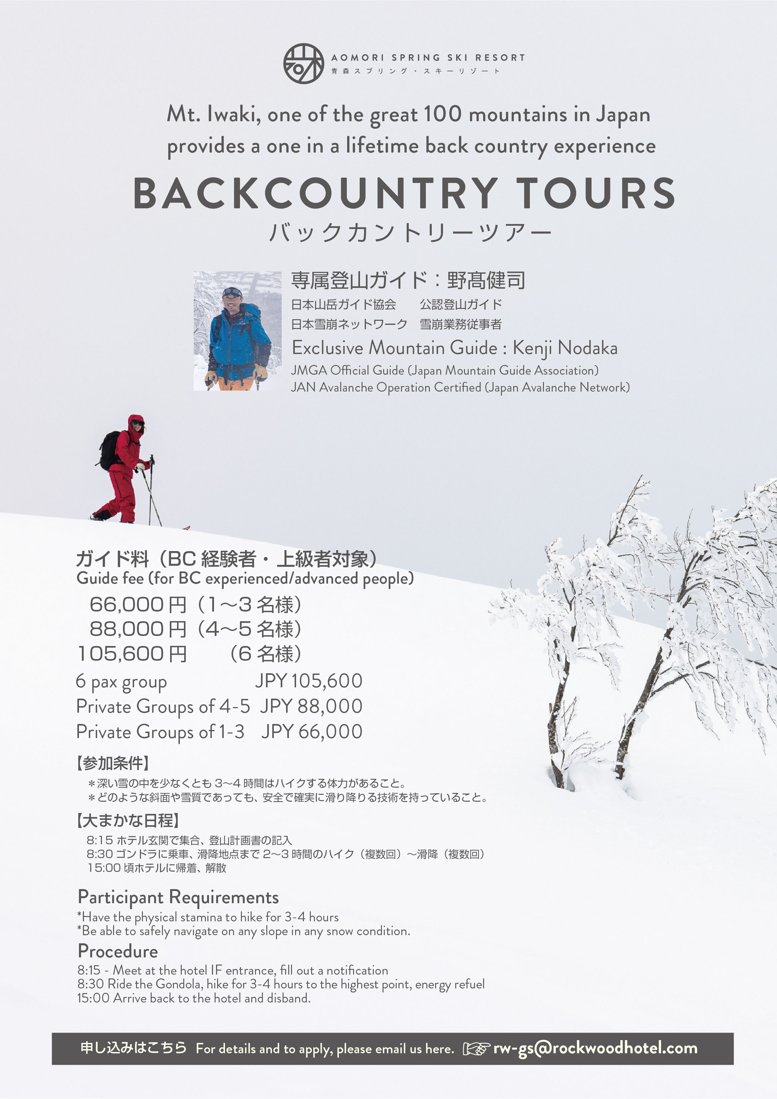 Package price includes bi-lingual guide (Japanese & English). Price does NOT include lift ticket nor insurance. Guests are requested to hire insurance which covers backcountry activities before joining a group or private tour.